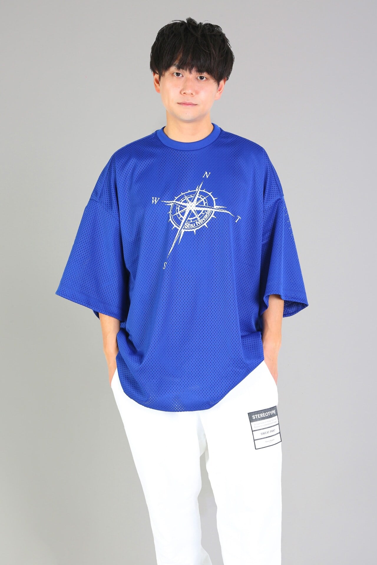 メッシュオーバーサイズTシャツ(胸元ロゴ入り青) | Shu NeVaDa